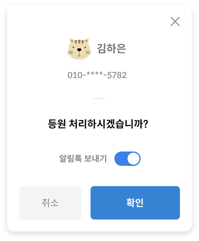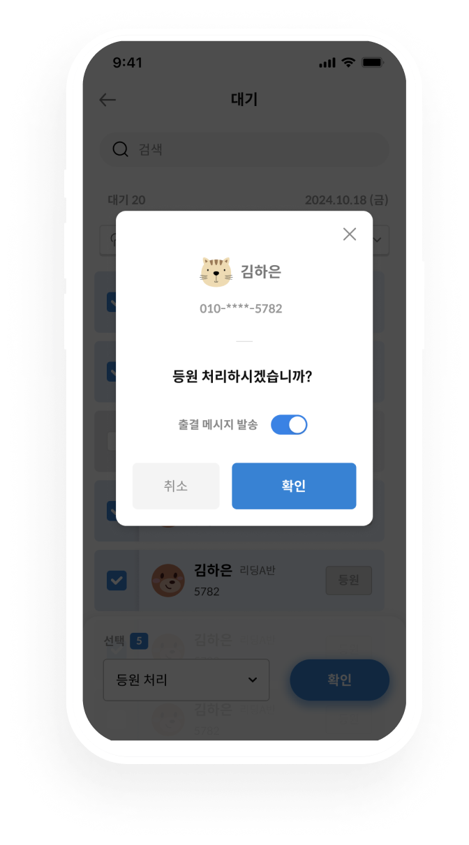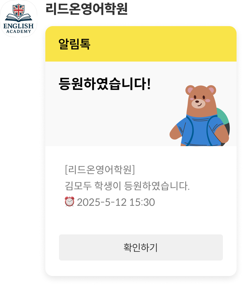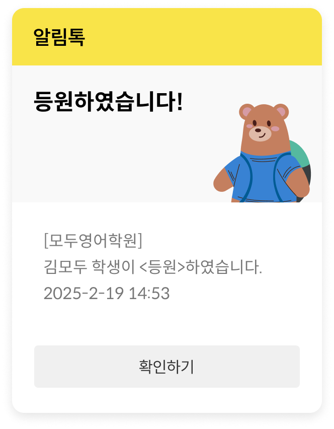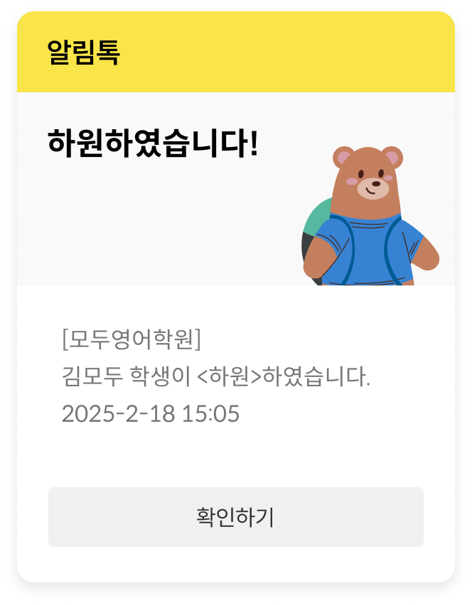 아이의 출첵과 동시에 학부모에게 안심 출결 알림이 발송됩니다. 발송 실패 없는 카카오 알림톡으로 원장님도, 학부모도 모두 안심할 수 있어요.