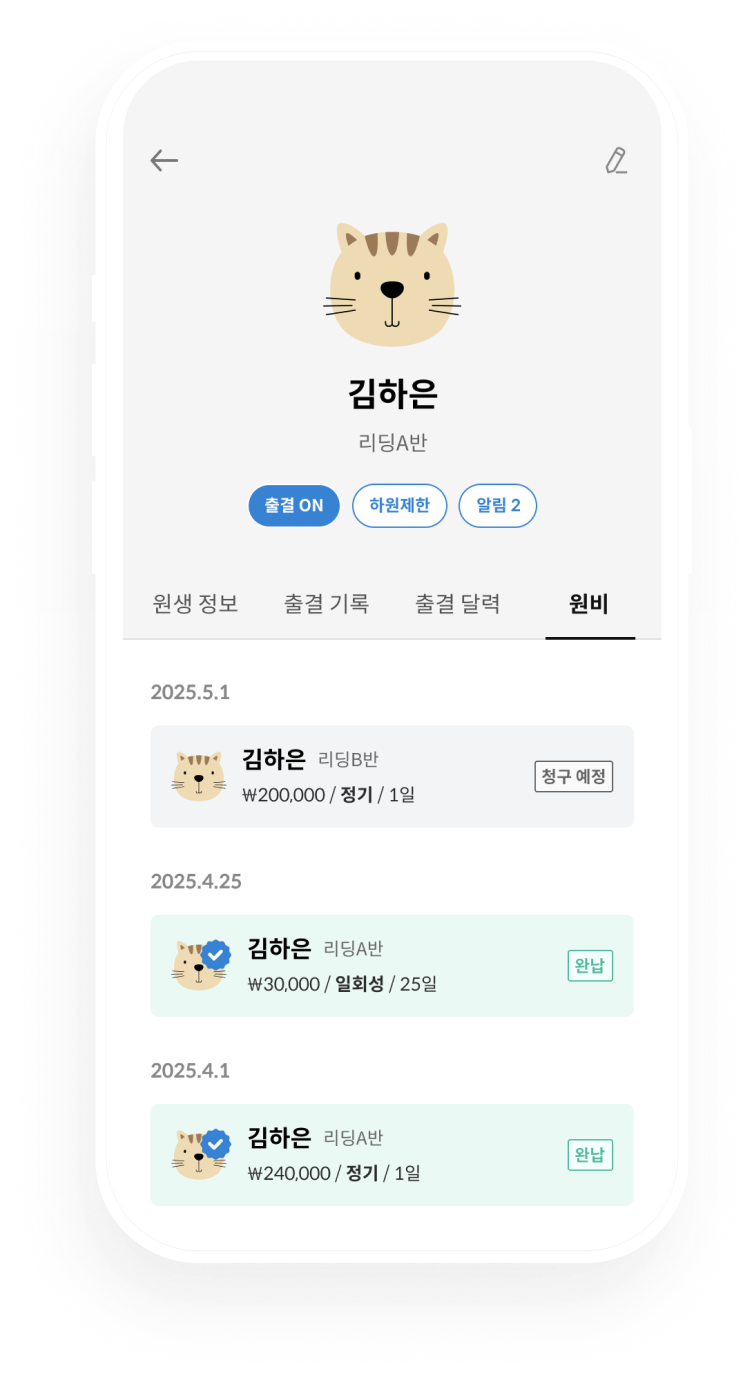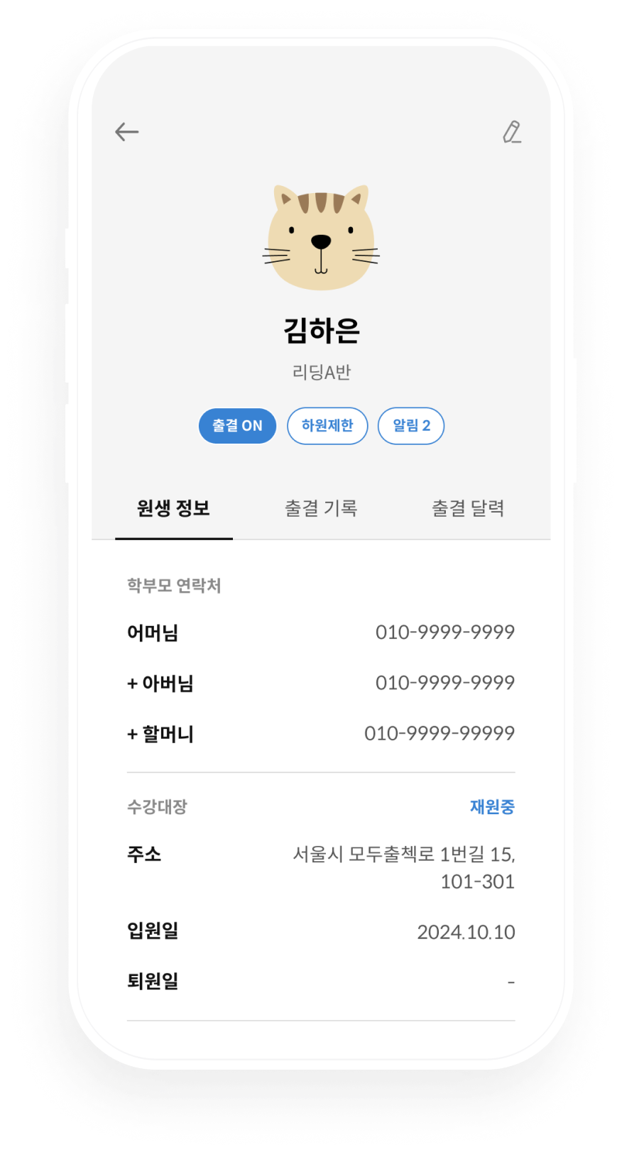 학부모 전화번호부터 수강대장의 필수 정보, 학교, 학년, 생일 같은 부가 정보까지 필요한 만큼만 입력하세요. 귀여운 프로필 사진은 덤이에요!