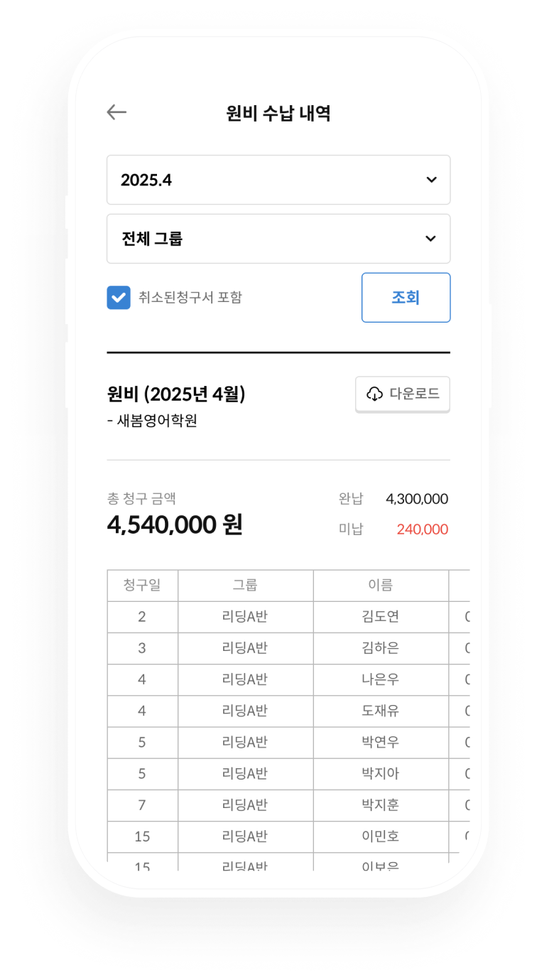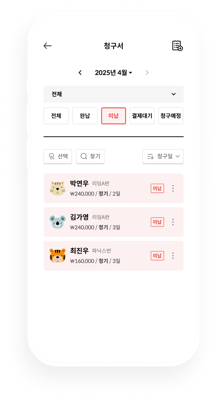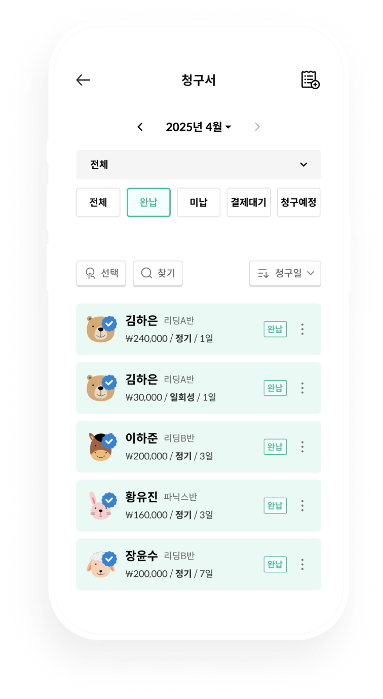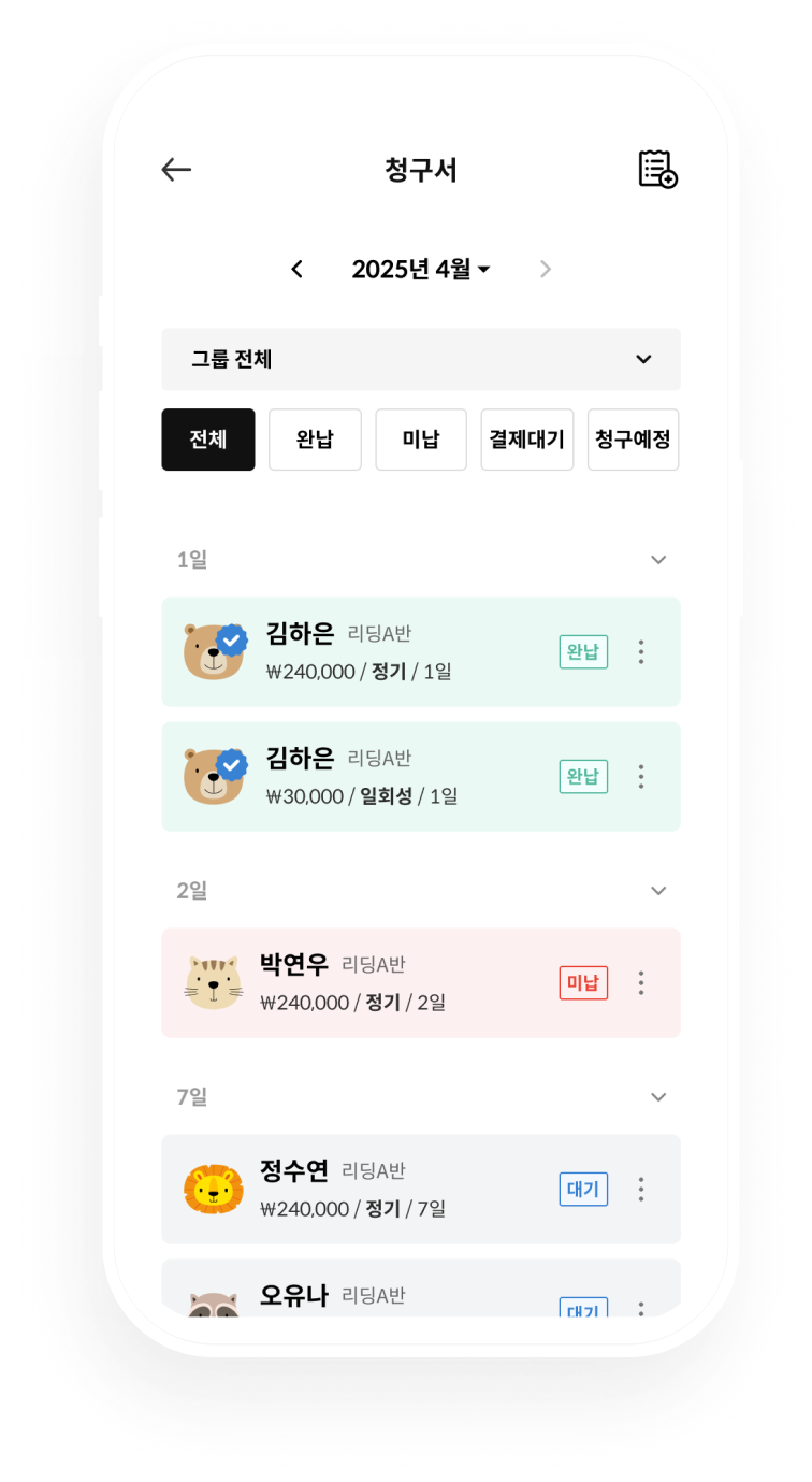 결제 즉시, 자동으로 수납 내역 업데이트! 언제든지 수기로 수납, 미납 처리도 할 수 있어요.