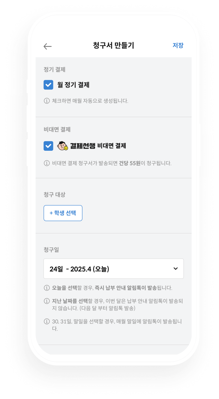 번거로운 연락처 입력 없이, 등록된 학생을 선택하여 쉽고 간편하게 청구서를 만드세요.