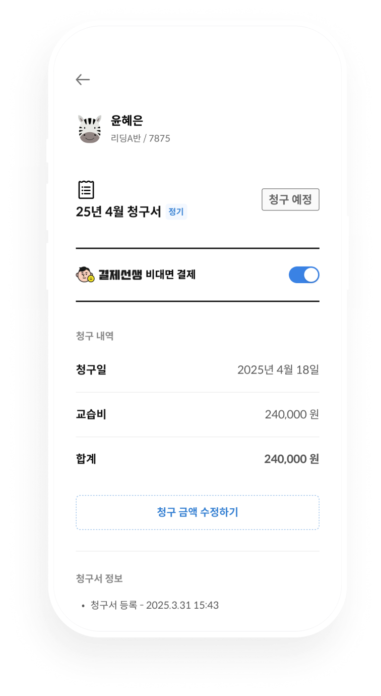 "모두출첵"이 "결제선생"과 만나 더 강력해졌습니다. 원비 수납과 관리까지 모두출첵에서 자동화하여 학원 운영 시간을 획기적으로 줄여보세요.