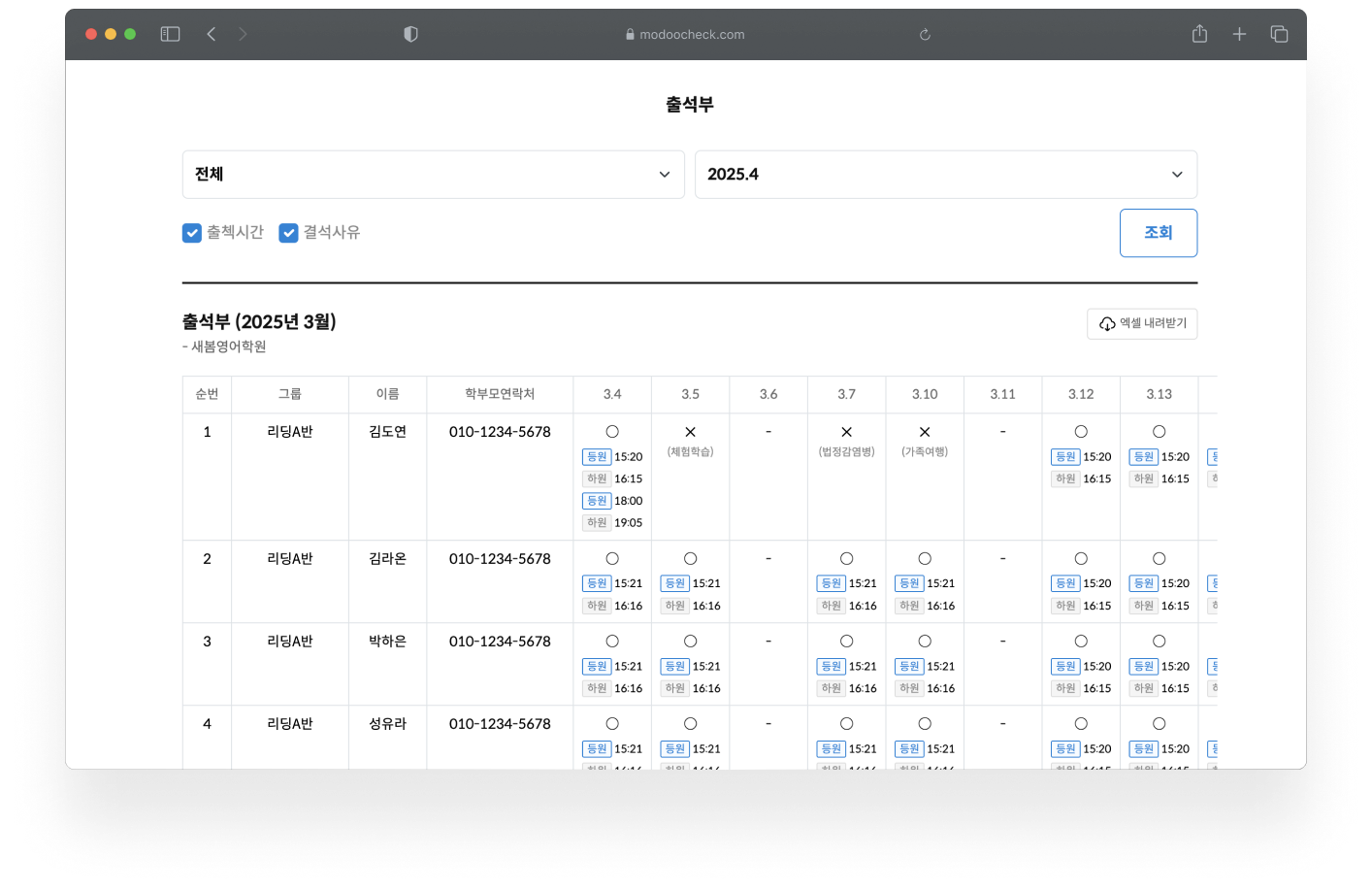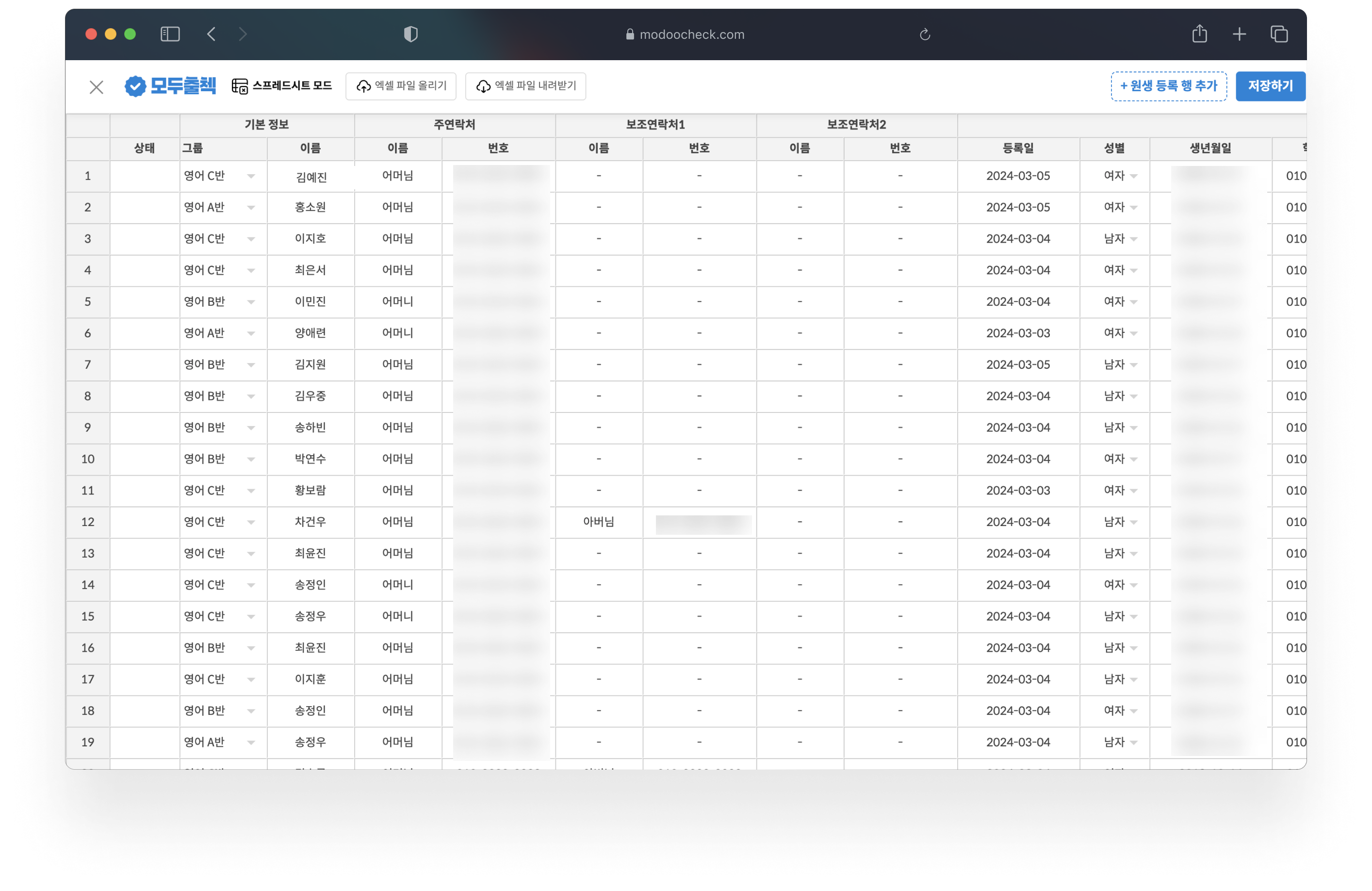 모두출첵의 스프레드시트 모드를 사용해 보세요. 기능은 엑셀과 거의 똑같고, 파일 업로드와 내보내기도 지원합니다. 한 번에 학생 전체 등록도 가능해요!