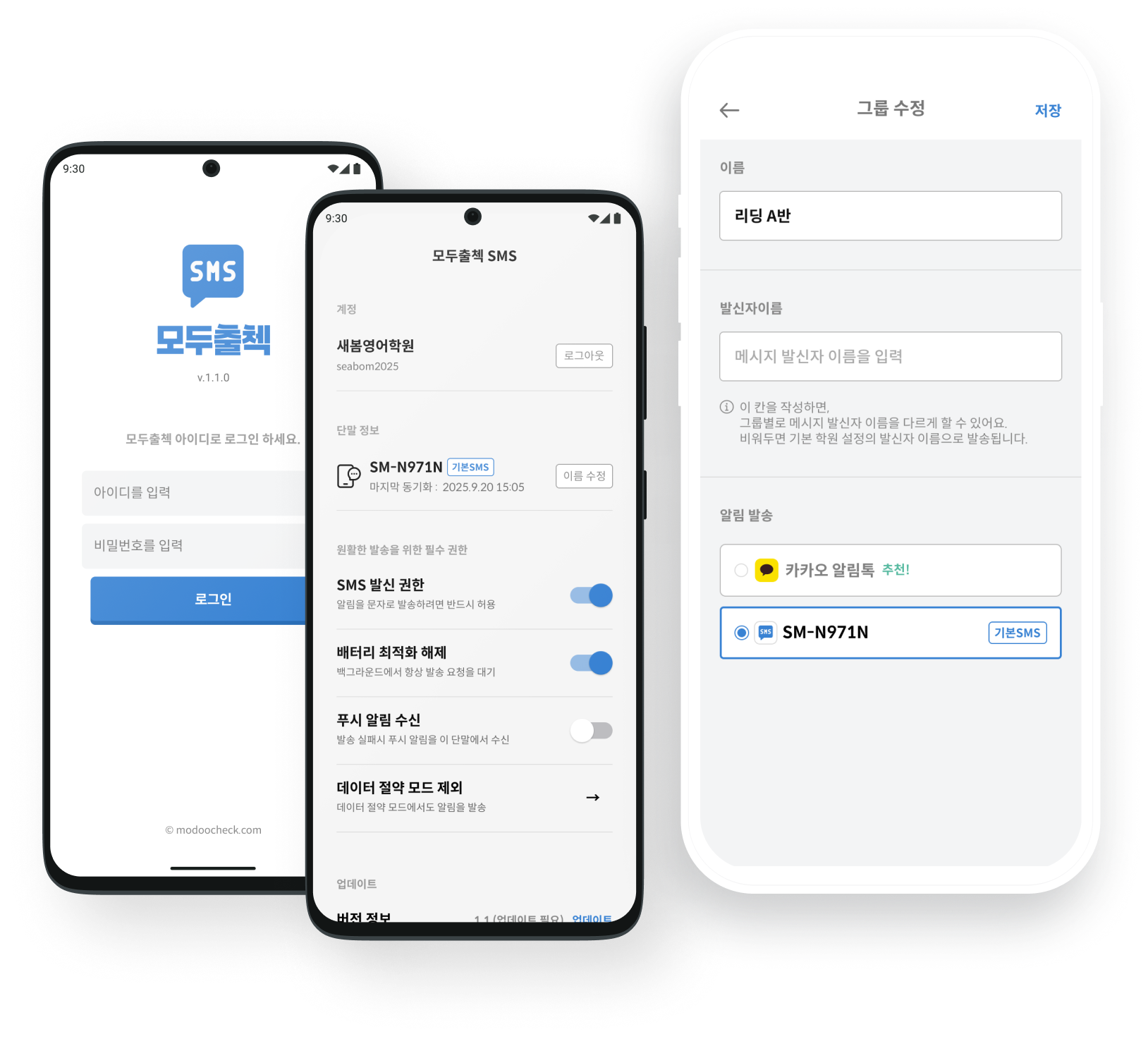 정상 개통된 안드로이드 스마트폰에 ‘모두출첵 SMS 앱’을 설치하고, 모두출첵 계정과 연결하면 통신사 요금제의 무료 문자로 출결 알림을 발송할 수 있습니다.